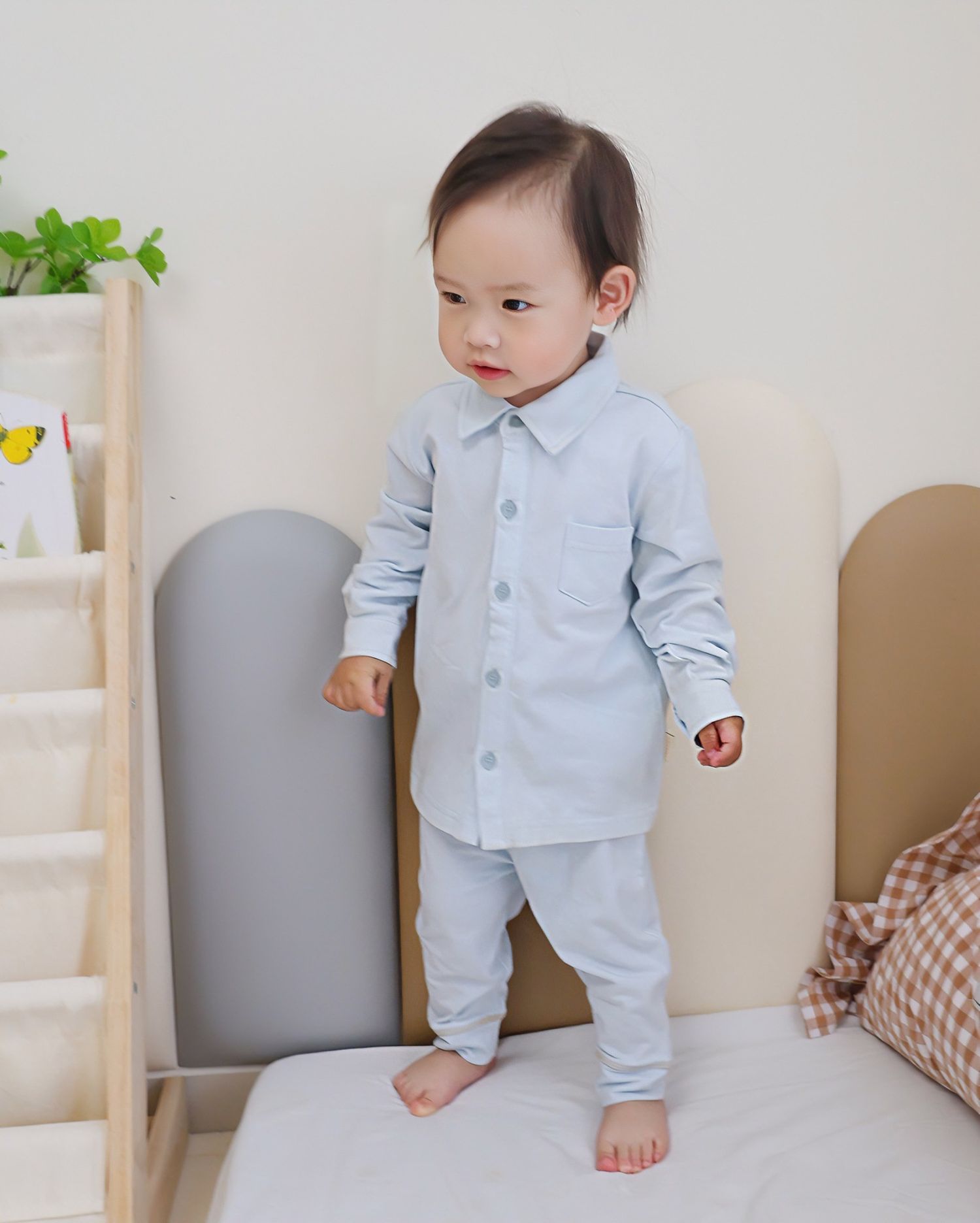 Урдаа товчтой, зөөлөн даавуун хөвгүүдийн цамц. Гэрт, гадаа, цэцэрлэгт гээд хаана ч өмссөн болох классик хийцтэй.